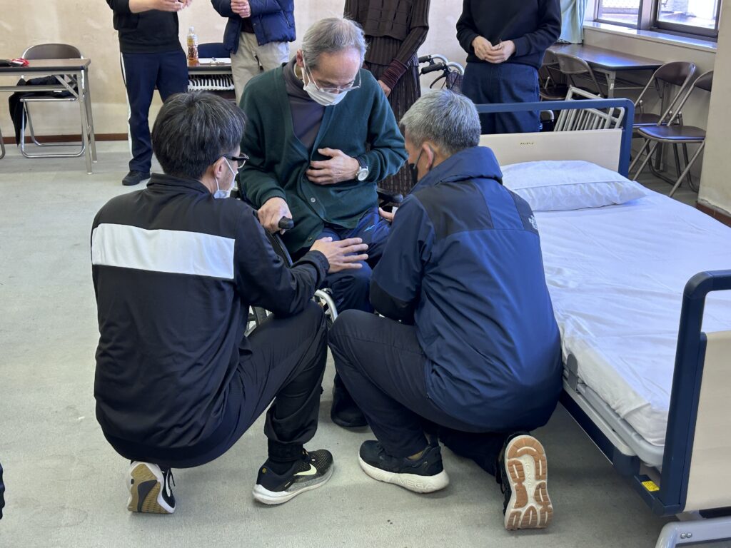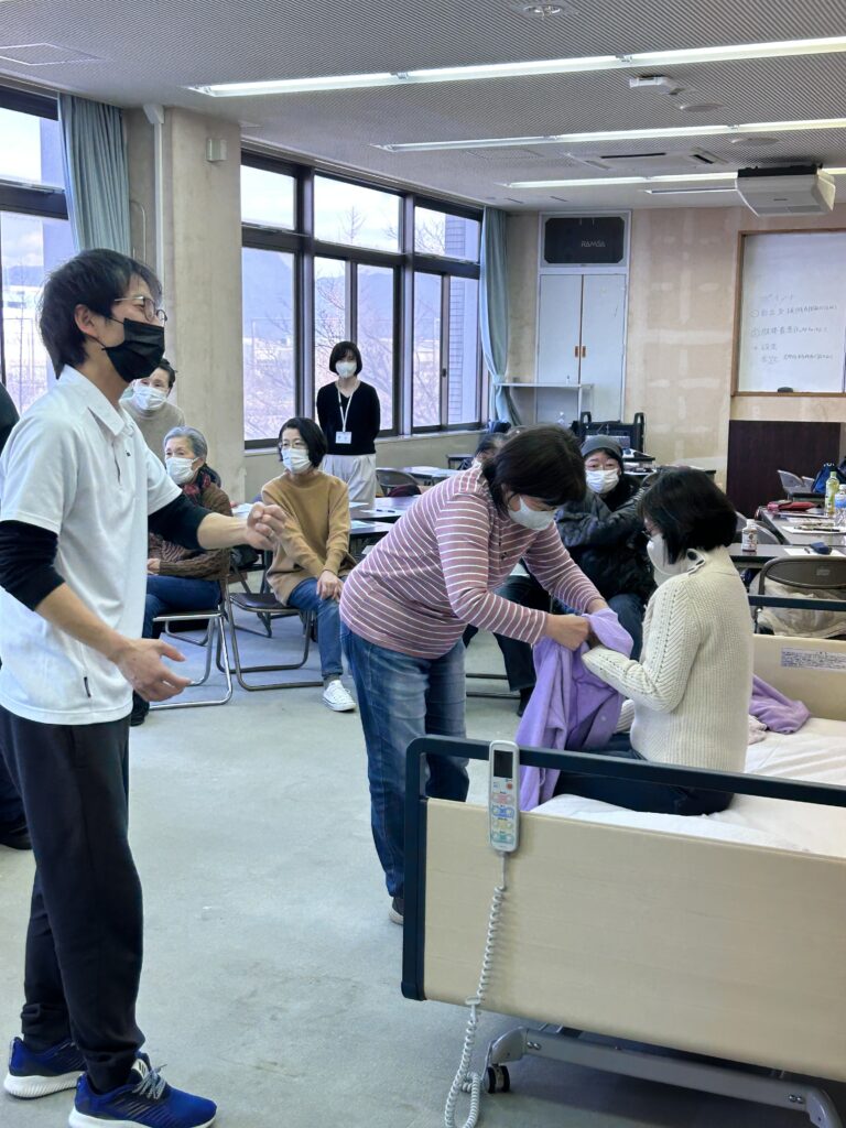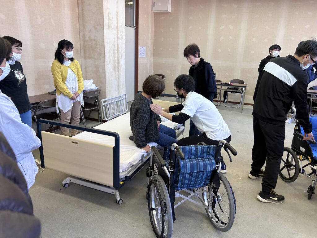 介護する上での知識だけでなく、ベッドと車いす、パジャマなどを準備して、実際に身体を使って学ぶ実技を中心とした回になりました!